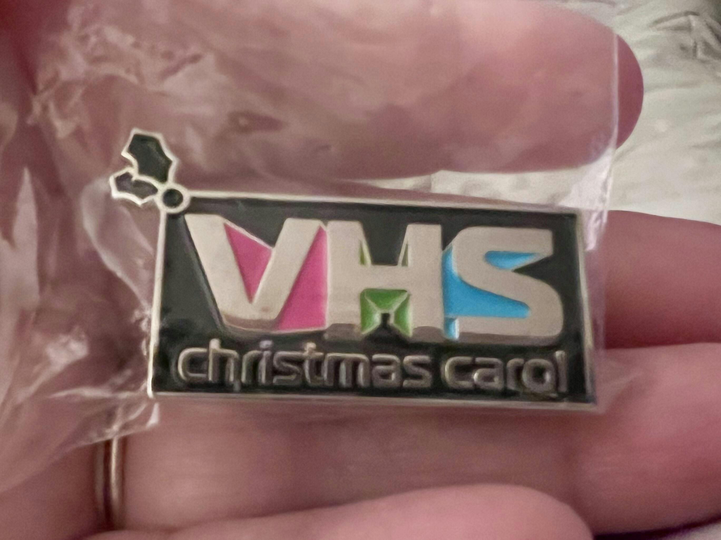 A soft enamel pin featuring the VHS Christmas Carol logo!